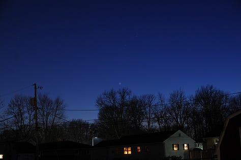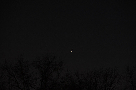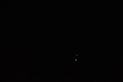 My photos in the above gallery represent 3 very practical perspectives. The first was taken with a 50mm lens on a full-frame dSLR and does a good job replicating the human field of vision. The second was shot with a 200mm telephoto lens, replicating the field of view offered by binoculars. The last was through a 600mm telescope, representing low telescopic power. The following day, the planets’ separation was approximately halved.